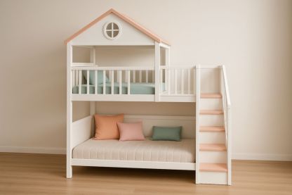 Lit superposé pour enfants en bois blanc et rose